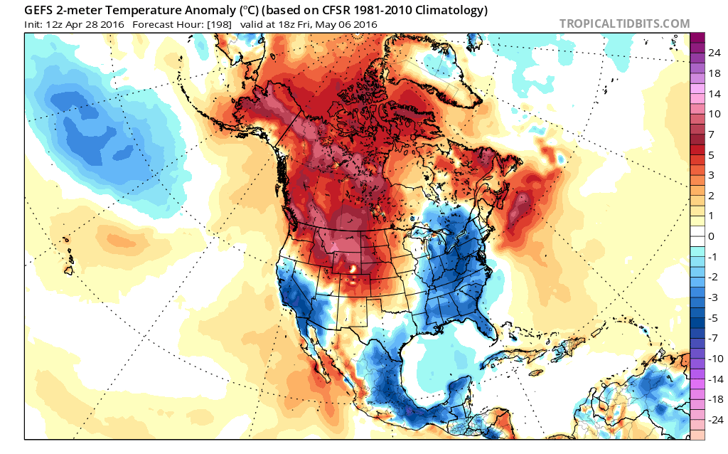 High-latitude blocking returned this week. After a warm start early this week, confluence from an upper-level over Southeast Canada forced a frontal boundary south of the region. This produced cooler than normal temperatures for the rest of the week. As a result, April will likely finish near or slightly below normal on average. It appears that May will start not only cool, but also wetter. So will May also be a cooler and wetter month as a whole? Or will a warming, drier trend occur again later in the month?