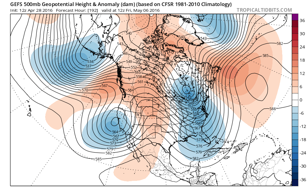 Secondly, warmer sea-surface temperature anomalies over the tropical Pacific have diminished and cooler waters have been upwelling near Ecuador. This indicates El Nino is weakening and may transition to La Nina later this year. But double-digit negative 30-day and 90-day SOI values as of April 26 still indicate that El Nino conditions still persist and are having influence on the atmospheric pattern over the Pacific. So some El Nino enhancement of the subtropical jet over the Pacific may still be occurring. Also some guidance showing that tropical forcing may return over the Indian ocean and become active during late May and early June. This will need to be monitored for an influence on the atmospheric pattern during this period and beyond.