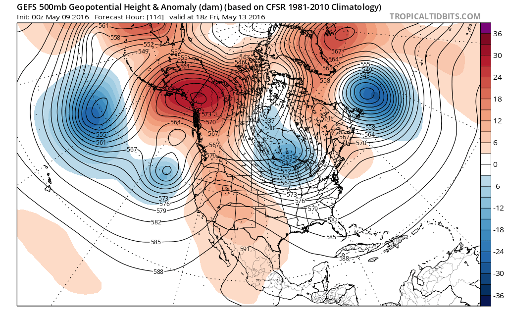 An EPO ridge and block, developing in the Pacific Northwest and British Columbia, will then cause a trough to close off and amplify in the Great Lakes later this week. This will cause height rises over the Northeast and Mid-Atlantic region on Friday. At the surface, a cold front will move across the region on Friday with a good chance at some showers. Some thunderstorms are possible with some instability (lapse rates and CAPE) ahead of this front, but organized severe weather is not anticipated at this time, with model guidance currently showing a notable lack of deep-layer shear for storm organization. Temperatures on Friday will reach into the upper 60s and lower 70s depending on amount of clouds before showers arrive.