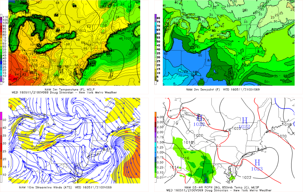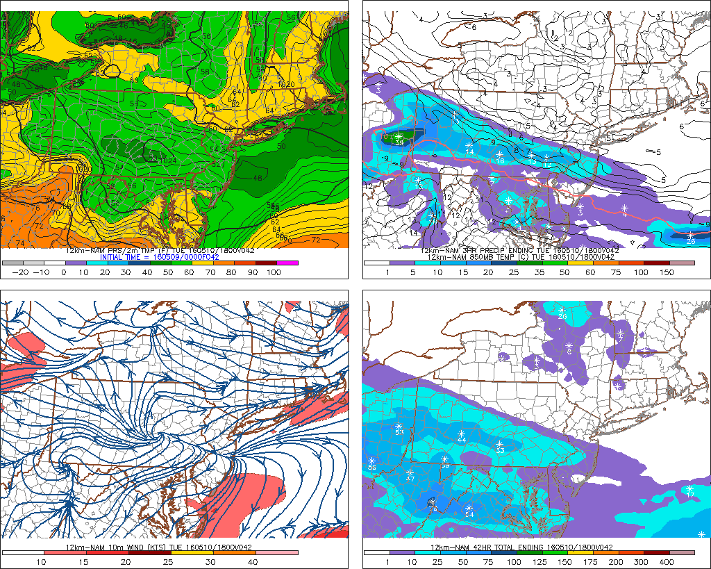 The NAM showing showers over Central and Southern NJ Tuesday afternoon with frontal boundary to the south. Temperatures range from 50s south to 60s further north