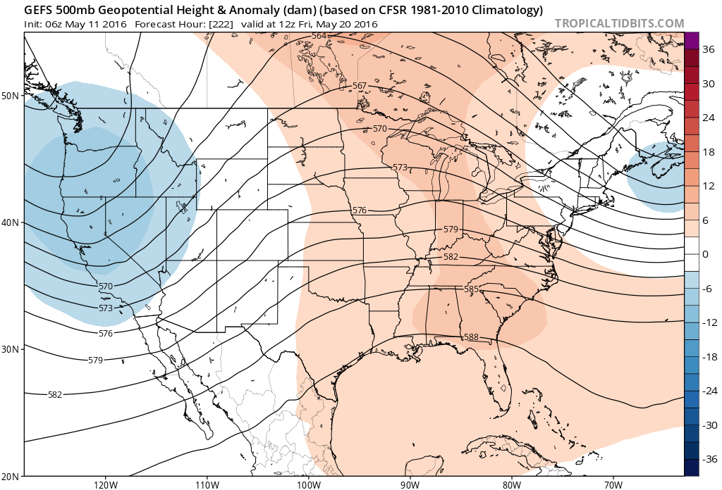 These troughs on the Western USA coast are, more often than not, associated with building ridges to their east, from the Central Plains toward the Ohio Valley and Eastern United States. Above normal temperatures often surge eastward as well, with a more southwesterly flow developing in the aforementioned areas. Forecast model and ensemble guidance, not surprisingly, have begun to hint at the warmup by the tail end of the month of May.