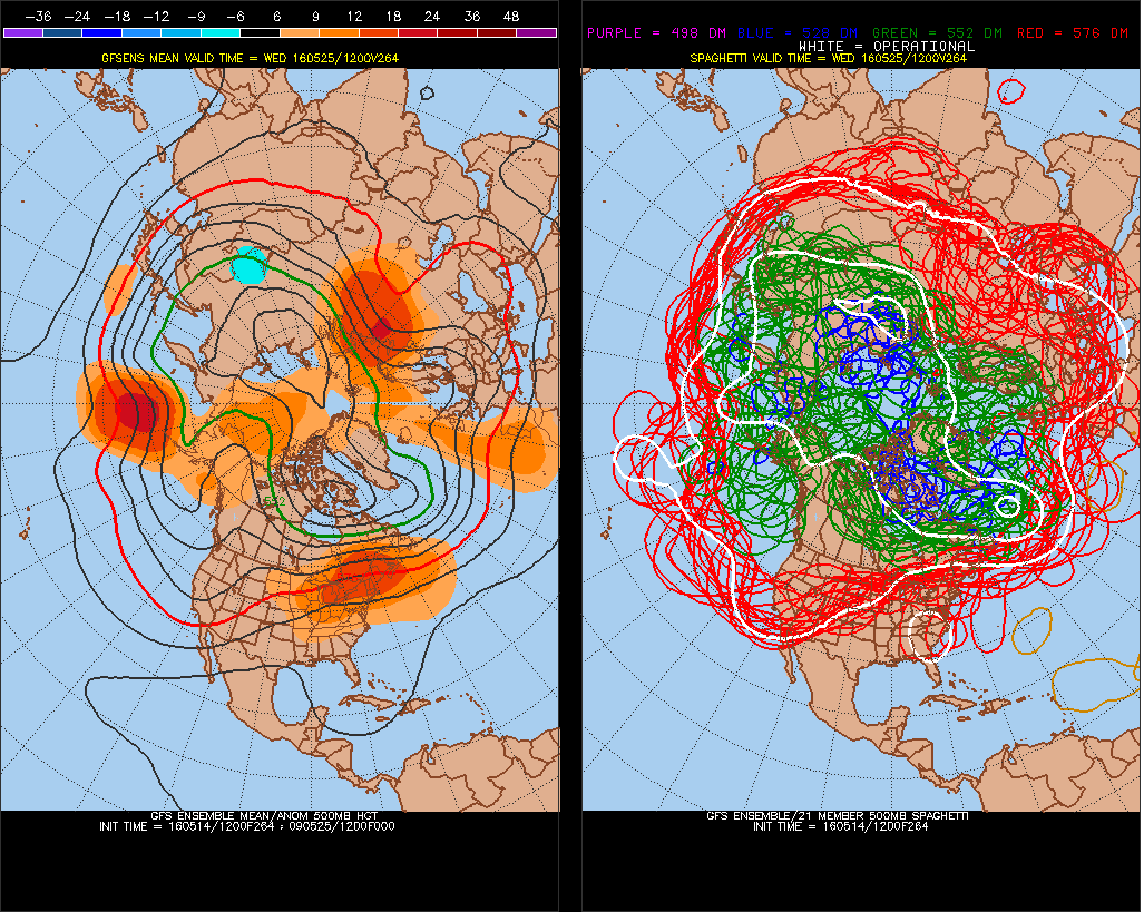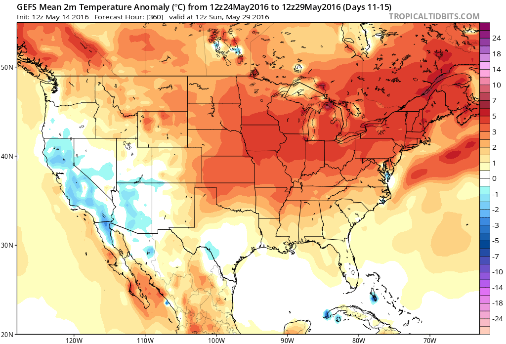 The GFS and ECMWF ensembles have been consistent with higher heights and warmer temperatures in the East. May analog years with a +PDO and decaying strong El Nino event, along with the MJO/tropical forcing shifting Martime Continent or Indian Ocean (phases 3/4 ) which are typically warmer phases for the East Coast, leads to high confidence in above average temperatures overall during late May — particularly the week leading up to Memorial Day Weekend.