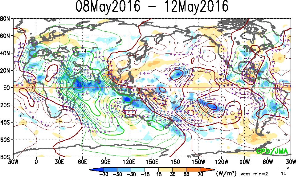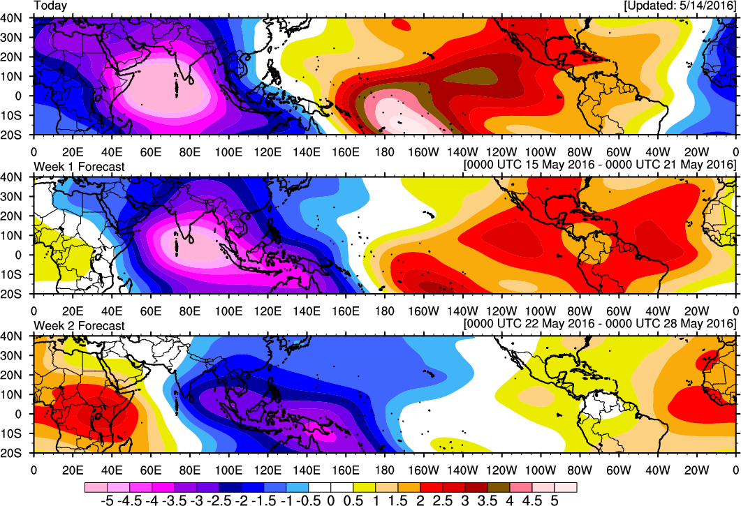 200mb Velocitiy Potential anomalies show the MJO with tropical forcing over Indian Ocean and Indonesia over the next two weeks (Image credit. Michael J. Ventrice)