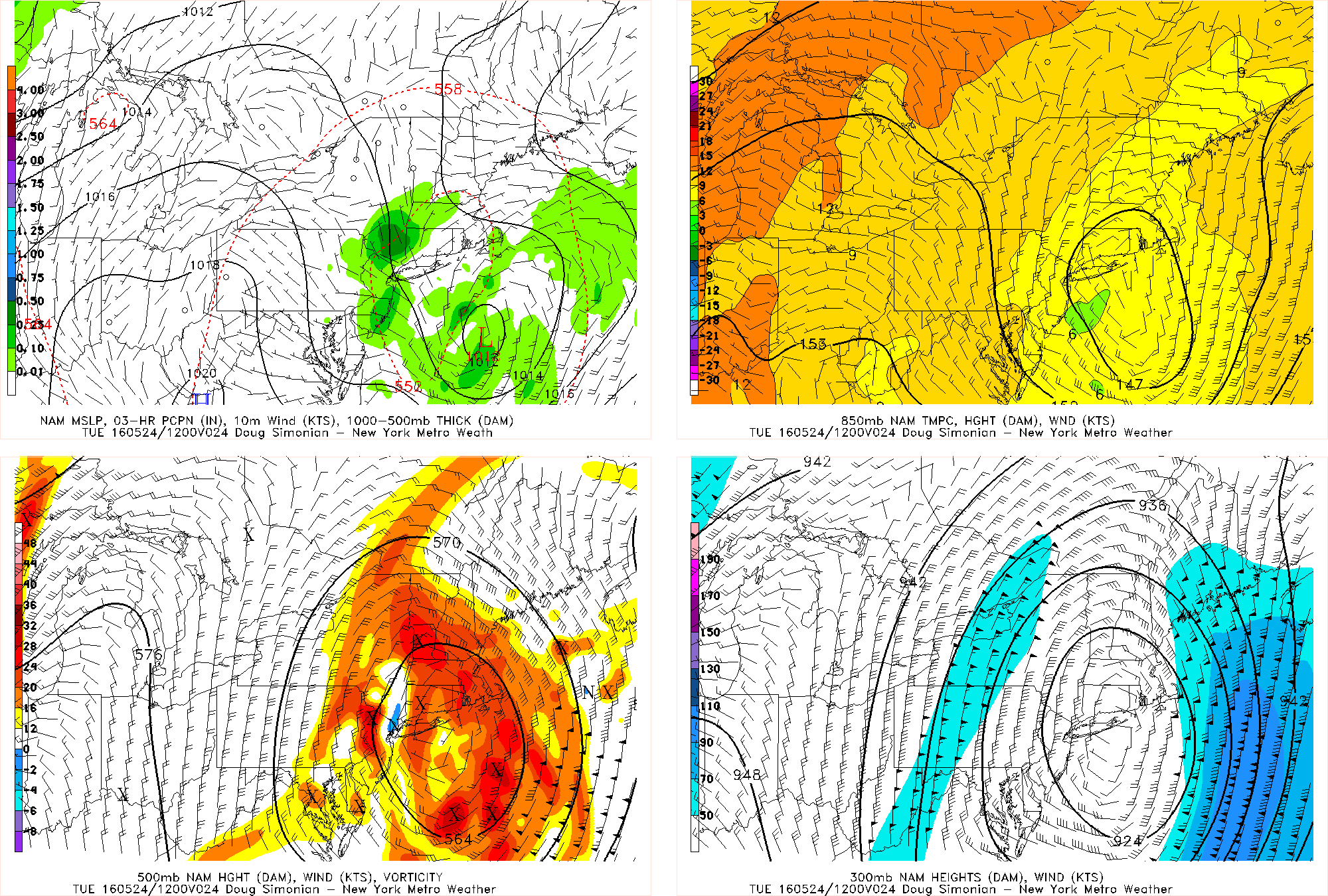 Showers may become more a little widespread later tonight and Tuesday with the cut-off low moving northward closer to the region. We will have positive vorticity advection from the cut-off low and it will produce a strong jet streak offshore — putting us in the left-exit region. Additionally, we will have upper-level diffluence. These are all good factors for lift and precipitation, giving us some moderate and localized heavy rain at times tonight.