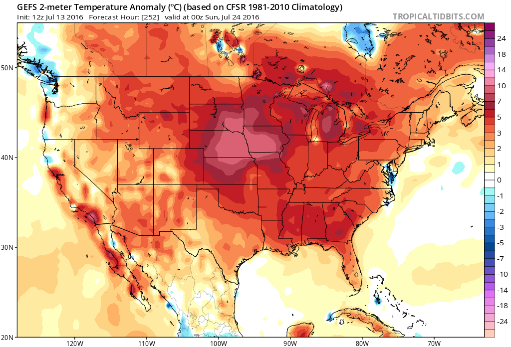 A large and anomalous heat ridge is forecast by most mid-range operational and ensemble model guidance to build over the Central United States. The process will actually begin by early next week, as heights in the mid and upper levels of the atmosphere rapidly increase over the Central United States. Troughing over the Northwest United States will act to enhance this ridging, with mid and upper level heights approaching anomalous levels by the middle to end of next week.