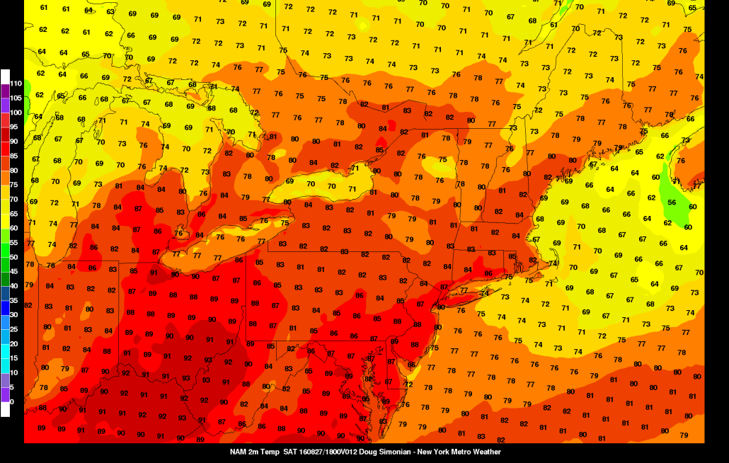 Sunday will be mostly sunny again with high temperatures likely in middle to upper 80s, at least over inland sections. However, with high pressure further shifting northeast of the region, this will cause more southeast winds and sea-breezes to develop during the afternoon, especially over parts of Long Island and other south-facing shore. Which may see high temperatures only in the lower to middle 80s tomorrow. Which is still slightly above average. Some other highlights for the next few days: