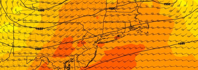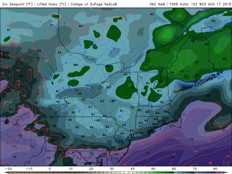 At last, relief from the oppressive temperatures and dew points has arrived. A cold front, which passed through the area early on Wednesday morning (not without some fanfare — with widespread lightning and torrential rain) will be the first in a sequence of events marking the end of the ridiculous humidity. While temperatures will reach near 90 once again on Wednesday, dew points will drop as the day goes on, owing to west-northwesterly winds. This will keep the airmass feeling gradually more comfortable than the days prior.