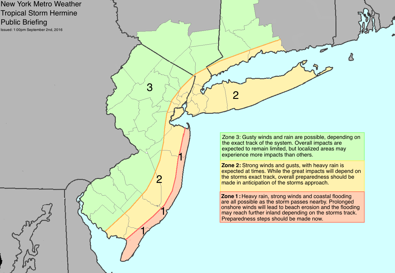 Wind: Strong winds 20-35mph with gusts near or over 40mph are expected from late Saturday evening through Monday from the Maryland shoreline to the New Jersey coast, including Long Island and the NYC Metro. Stronger wind gusts, near or over 60mph, are possible, especially along the Southeast NJ shore. It is possible that some of these winds may last into Tuesday or Wednesday, especially over coastal areas, as Hermine might continue to meander near or just off the coast.