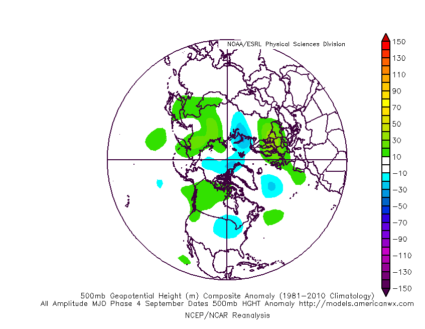 MJO Analogs in Phase 4 during the month of September show troughing and below normal temperatures over the Central US.