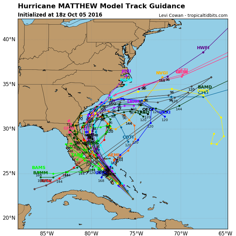 Latest tropical model guidance for Matthew showing a track near the Southeast US with minimal movement up the East Coast.