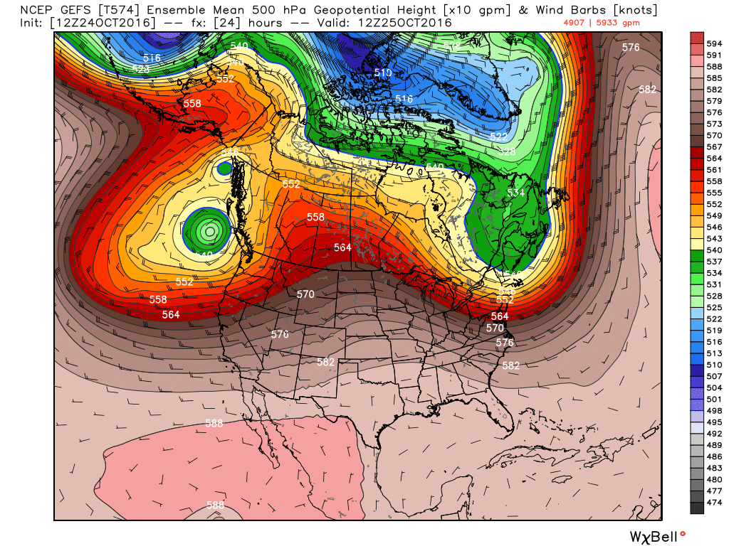 GEFS ensemble showing a trough over the Northeast US late this week leading to cold temperatures in the Northeast US.