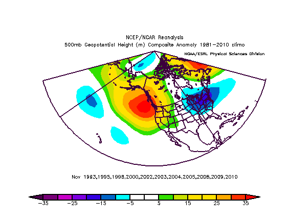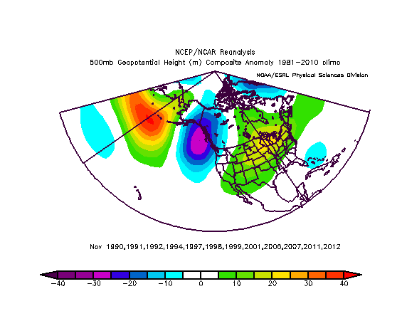 The Novembers preceding the colder/snowier than normal winters in NYC since 1990 produce the following 500mb atmospheric height anomaly composite. These maps show the departure from normal heights (wave pattern) in the atmosphere.