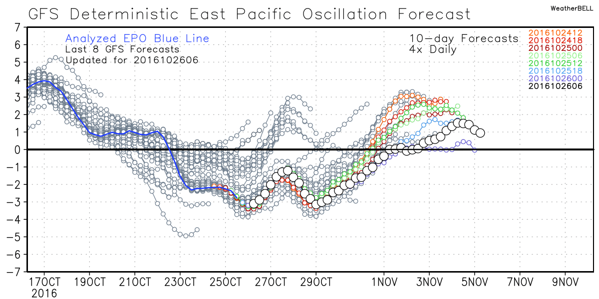 The North Pacific Pattern is just a piece of a very large puzzle which we will try to piece together over the next few weeks as Winter approaches. That being said, time has proven that it is a very important piece to the puzzle — one which may very well give us some important clues into the Winter ahead. Current forecast models indicate a rising (+EPO) index, at least to start the month of November.
