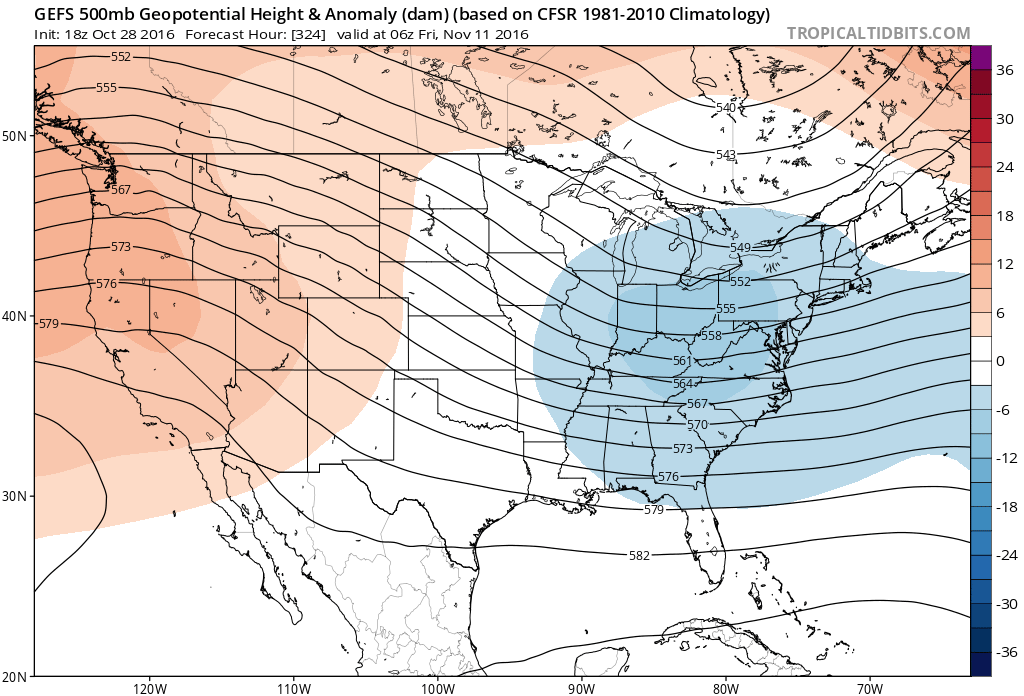 5-Day Averaged temperature anomalies will approach 10 degrees F and exceed 15 degrees F over a large area. This air will slowly seep eastward toward the Appalachian Mountains, and while its effects may be muted, it will still be quite notable. By and large, the Continental United States will be void of below normal temperature anomalies through November’s second week.
