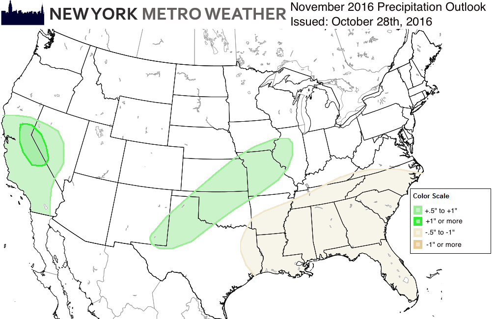 A very warm start to the month is expected country-wide, with the exception being the Northeastern US during the first half of the months’ first week. After 10+ days of above normal temperatures across a large area, a hemispheric pattern change is anticipated by the middle to latter half of the month. This should support temperature anomalies falling toward or below normal across the Central and Eastern United States from the end of November into December.