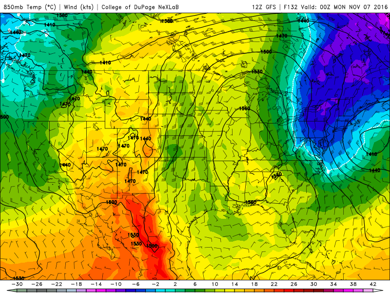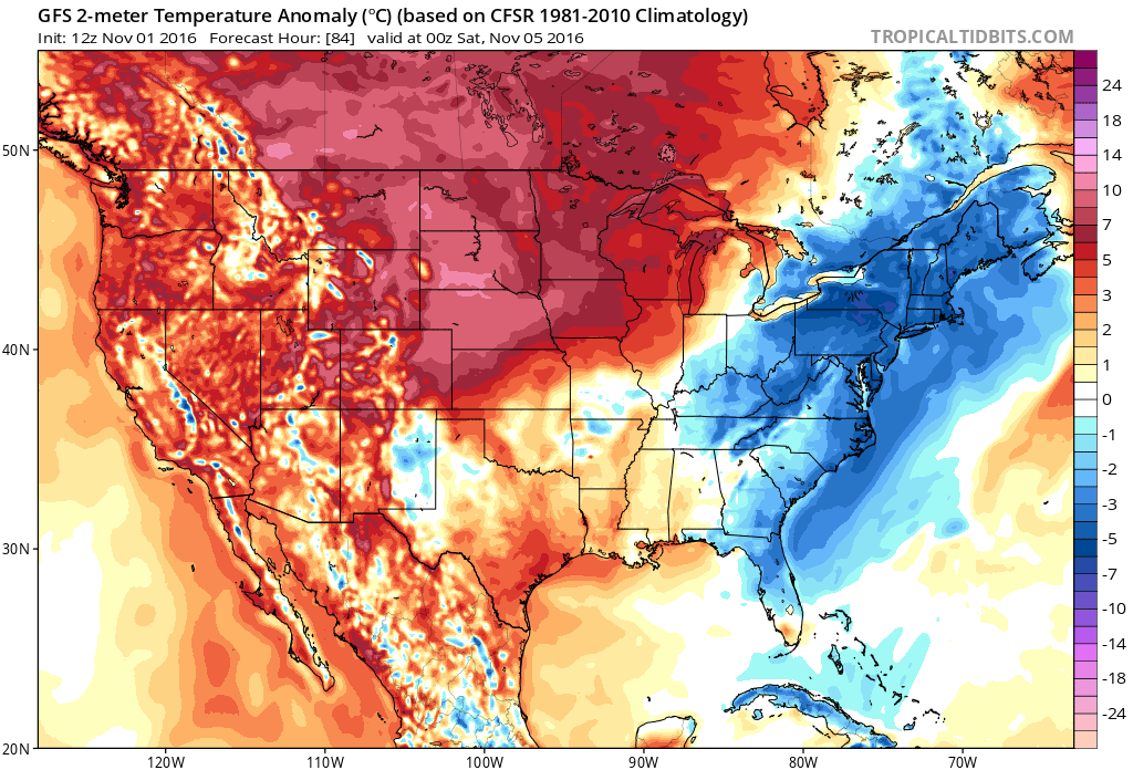 The temperature gradient associated with this storm system will be impressive, with temperatures at 850mb (about 5000 feet above our heads) falling from 12 to 14 degrees Celsius during a 12 hour time span. The warm airmass from Thursday afternoon will be replaced by a cold one by Friday morning, with rapidly falling temperatures. Temperatures will actually fall near or below seasonal averages throughout the East during parts of the upcoming weekend.