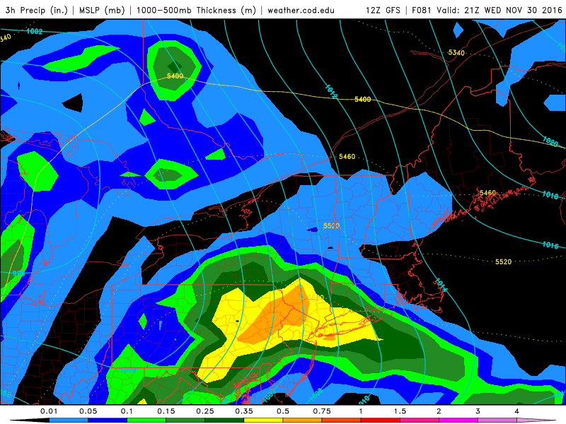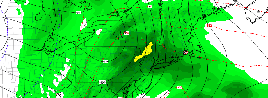 The first disturbance moves towards the Northeast US on Tuesday afternoon and evening. From the southwest will come an area of “Warm Air Advection” or the movement of warmer air towards a certain area (that’s us) in multiple levels of the atmosphere. With this warm air comes moisture, and not-coincidentally, with the warm air and moisture comes lift. A period of heavy rain will shift northeastwards from the Mid Atlantic through New England — with rainfall totals of near 1″ possible across a large area.