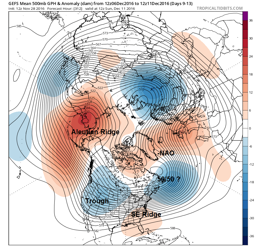 Interestingly enough the winter of 2010-11, which moderate La Nina and +QBO, also started Aleutian ridge and -PNA signal in November. Eventually that pattern evolved to with major high-latitude blocking retrograde during from late November through mid-December. We don’t currently believe this pattern to evolve to quite this extreme for December. But despite some warmer than normal temperatures initially to start next month, the pattern is still appears to be evolving into one that favors wintry weather in mid-December over the more of the CONUS.