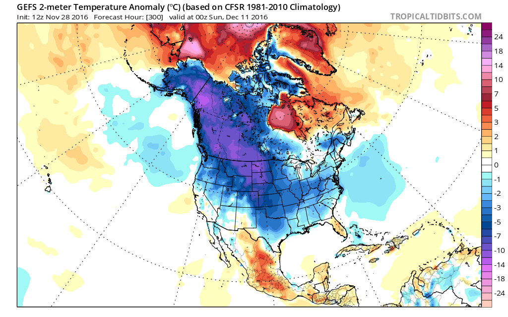 Multiple ensemble guidance indicate a major pattern change over the Pacific region. A ridge will builds near Aleutians then poleward into the Bering Strait and the Artic Ocean next week. This will cause cross-polar flow to finally setup over the North America. All the anomalous cold air that is has been over much of Eurasia for the last several weeks with finally see an open gateway into North America. Temperatures departures are forecast to between 10 to 20 below average over parts of the Rockies and Northern and Central Plains over next weeks.