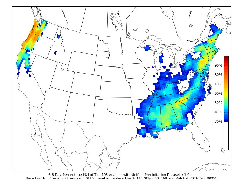 Analog products add confidence to the idea that the storm system will be rather notable, particularly for precipitation and the potential for strong to severe storms in the Deep south as mentioned above. Probabilities for moderate precipitation extend up the East Coast in to New England based on the analog set.