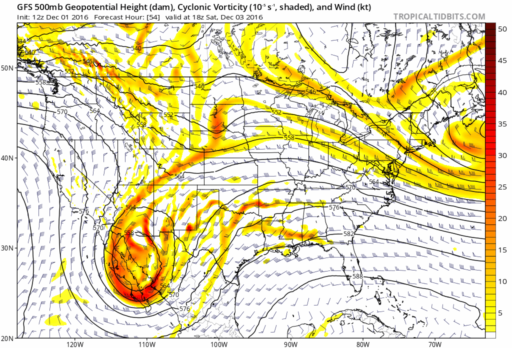 Much of the storm threat stems from the development of a cut-off low, or a trough and low pressure system cut-off from the jet stream, in the Southwestern United States later this week and weekend. This cut-off low looks likely to meander in that area for a period of time before ejecting east/northeastwards. The orientation of the upper level jet stream and height pattern suggests that the storm will eject from the Texarkana area towards the Mississippi and Ohio River Valley’s by the early and middle part of next week.