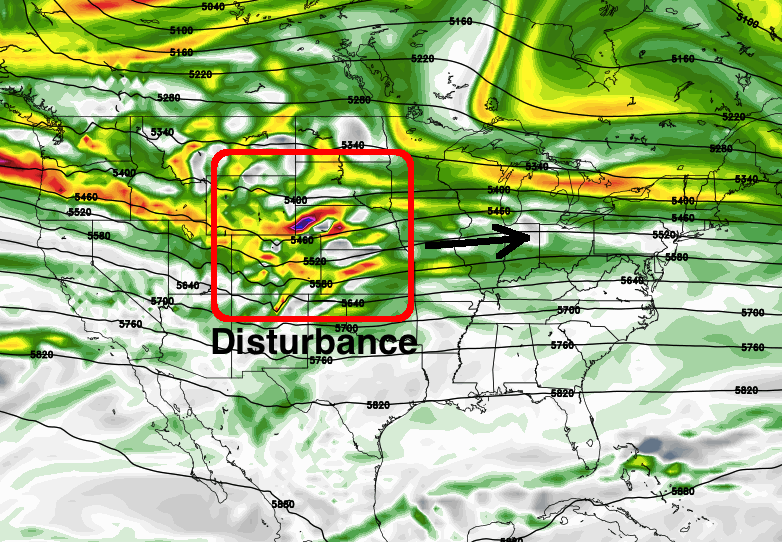 GFS model shows a disturbance ejecting eastwards from the Rockies this weekend, leading to the potential for snow across the Great Lakes, Ohio Valley and Northeast.