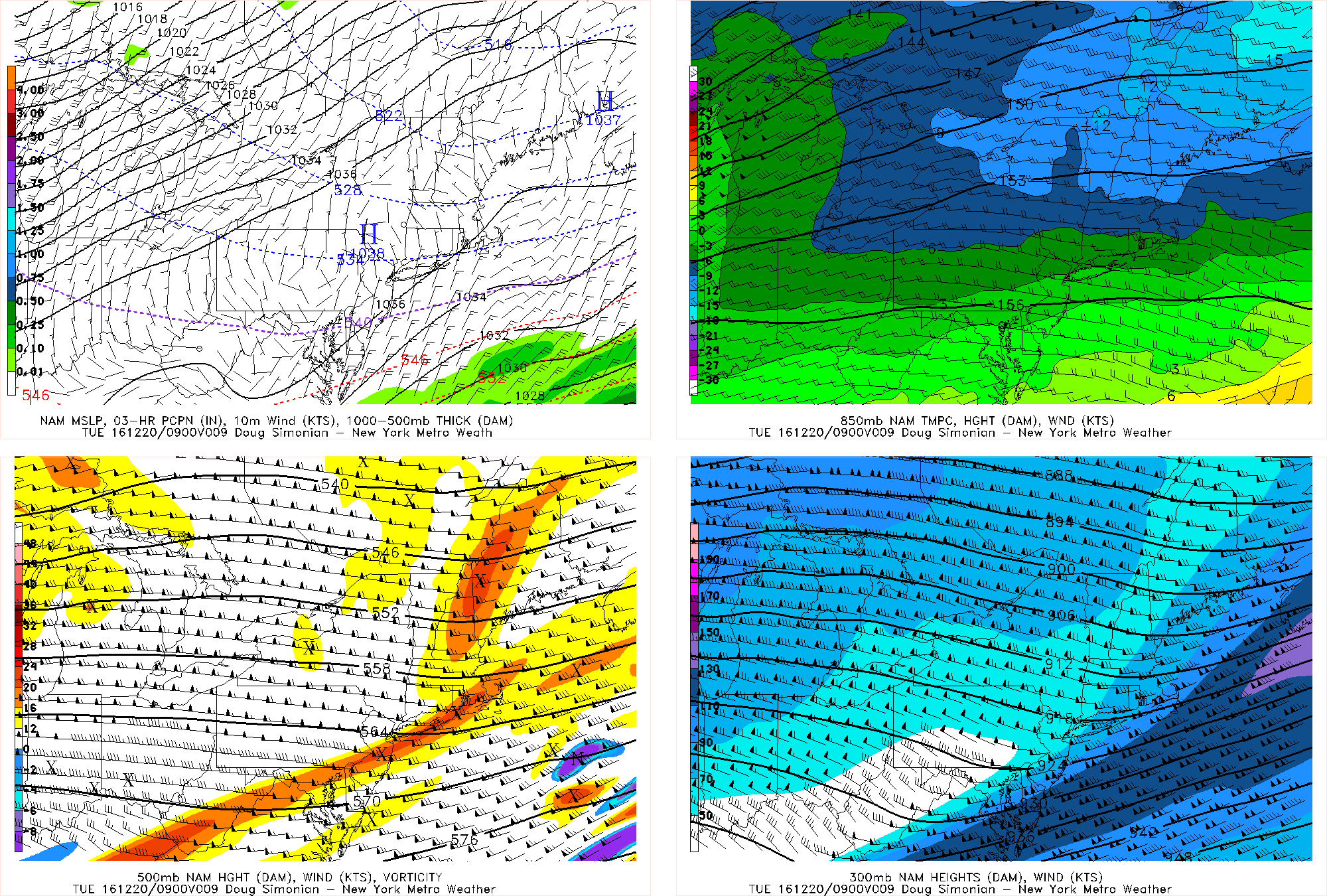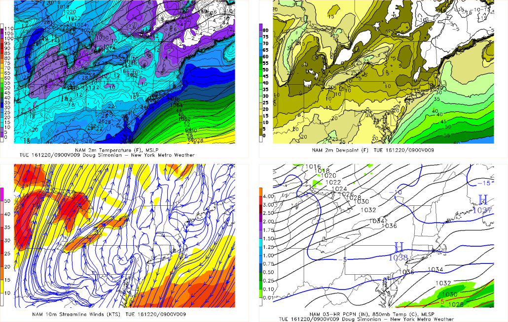 Here is a look purely at the surface. On the top left, we can see that temperatures have easily fallen into the teens for much of the area, though closer to the city with the urban heat island effect, it’s around 20 or in the low 20s. The winds are all generally very light and variable as evidenced by the streamlines, and the surface high pressure is leading to very low dewpoints across the while Northeast. Now, something that is interesting is that while the dewpoints are low, they are generally in the high single digits to low teens, which means that once temperatures fall, the atmosphere will start condensing once they hit the mid teens. This leads to air parcels cooling moist adiabatically rather than dry adiabatically, which slows down the rate of cooling as moisture and latent heat gets released into the atmosphere. This is why widespread single digits are not likely, though our coldest suburbs will probably still reach the single digits.
