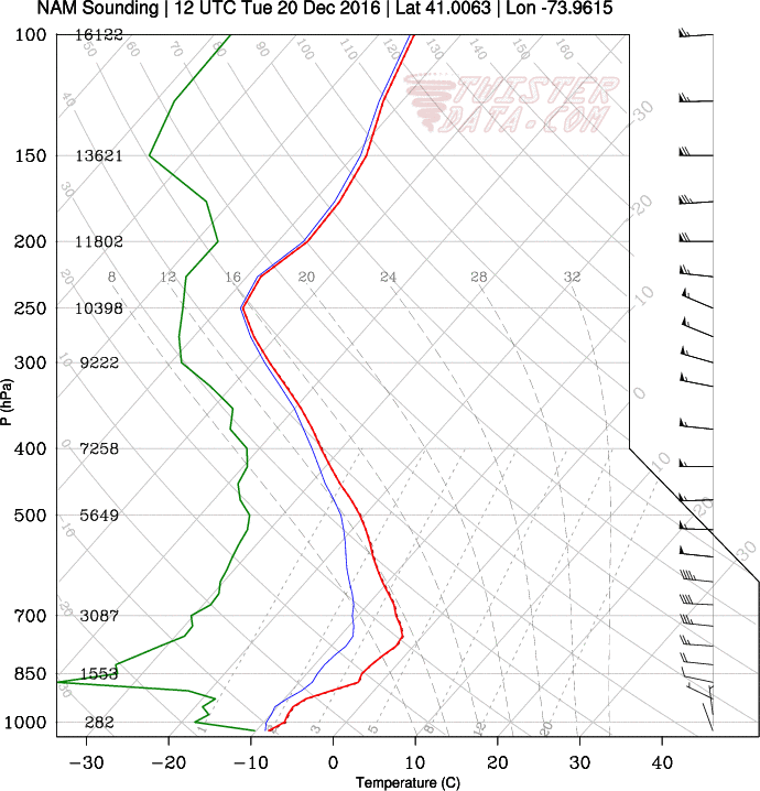 Now let’s look at the immediate surface. This is from NE NJ, so it’s a relatively rural area, where radiational cooling can occur more effectively than urban areas, due to surfaces with less albedo. This can further enhance the inversion by creating a secondary radiation inversion. This is clearly evident from the ground through about 1000mb, as the inversion is even more stout. This is an indicator that the radiational cooling has been significant, as it was enough to actually show the warmer air that escaped from the ground led to an even stronger inversion.