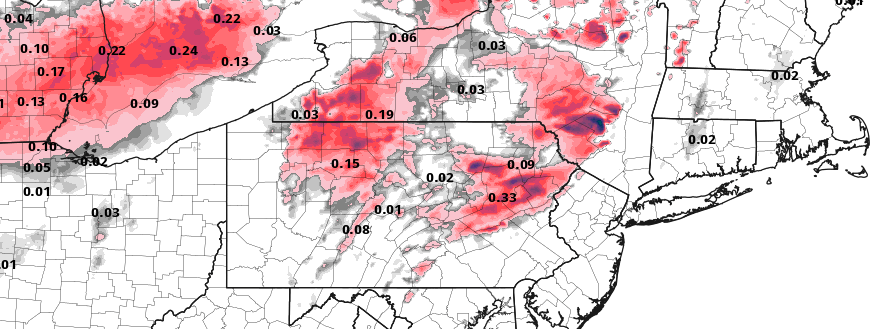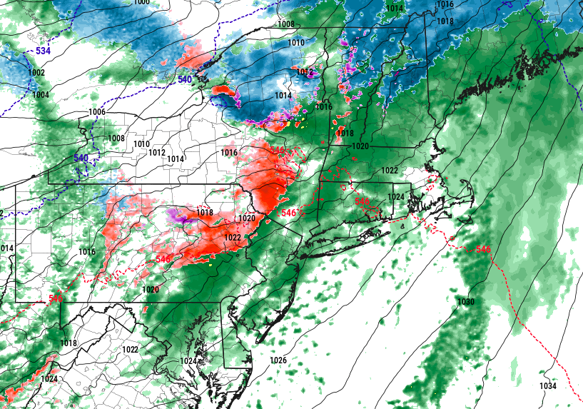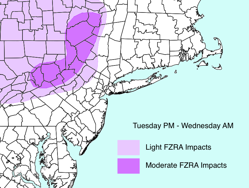 Forecast models show freezing rain developing across parts of Northeast PA, Southeast NY, and Northwest NJ on Wednesday morning.