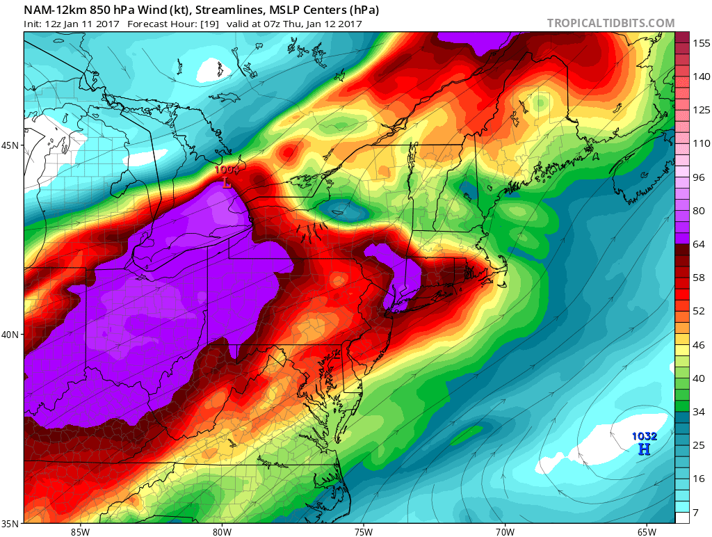 NAM model showing a strengthening southwesterly low-level with 850mb winds near 64kts