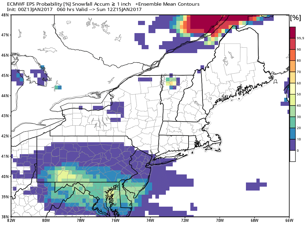 0z Euro ensemble mean showing 20-50% probability of 1″> snow tomorrow near the Mason Dixon Line