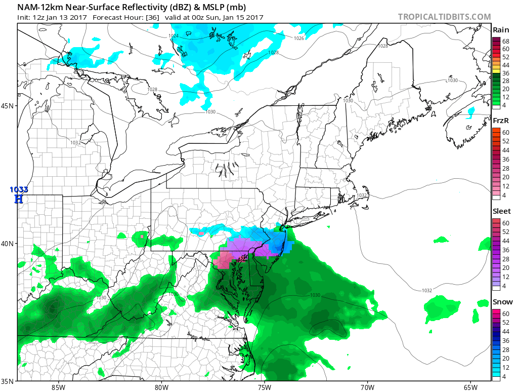 The 12z/13 NAM showing strong upper-level northwest flow and confluence with high pressure, keeping this system farther south of NYC metro Saturday