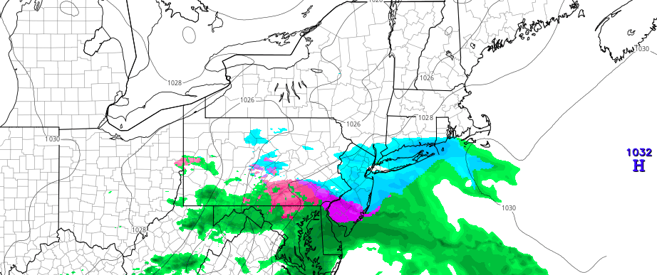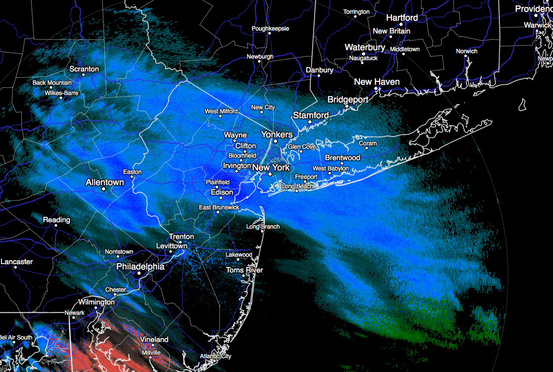 Snow is having some trouble reaching the ground currently, thanks to dry air in the middle and lower levels of the atmosphere. Radar is depicting a large amount of virga – or evaporating precipitation – throughout Northern NJ and Southeast NY. These areas are likely to continue to remain dry, with only very light snowfall at times as the atmosphere gradually moistens this afternoon.