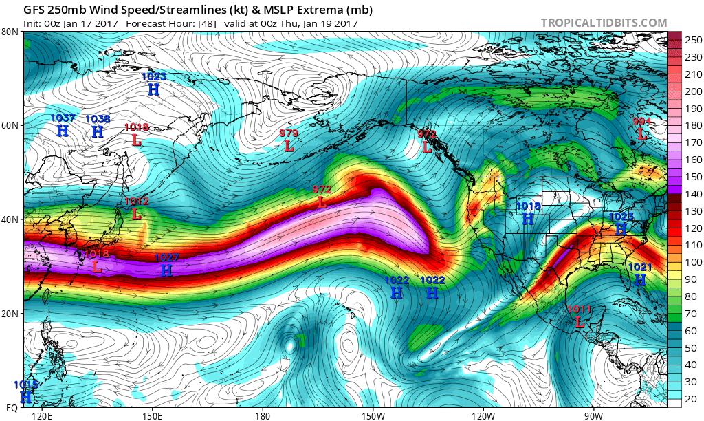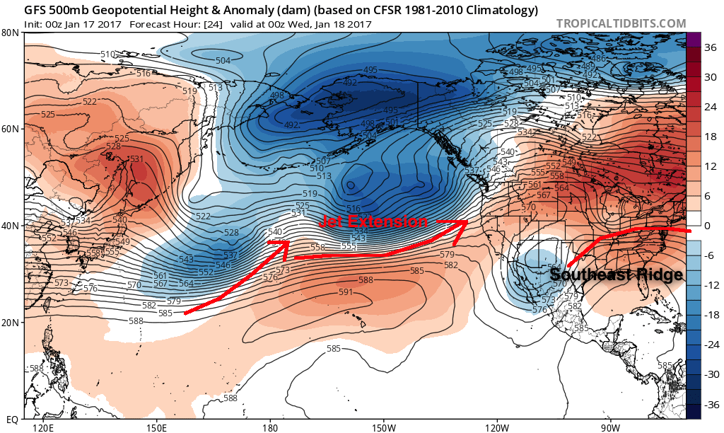 With this in mind, it’s important to note that the current weather pattern in the Pacific ocean is simply not conducive of any type of prolonged cold or wintry weather in the majority of the Northeast United States. A phenomena more commonly known as a jet extension currently exists there, with lower heights in the atmosphere pushing into the Western United States. Without any impetus to stop it, this allows warmer air to push into the Eastern US as storms track generally to our west and northwest.