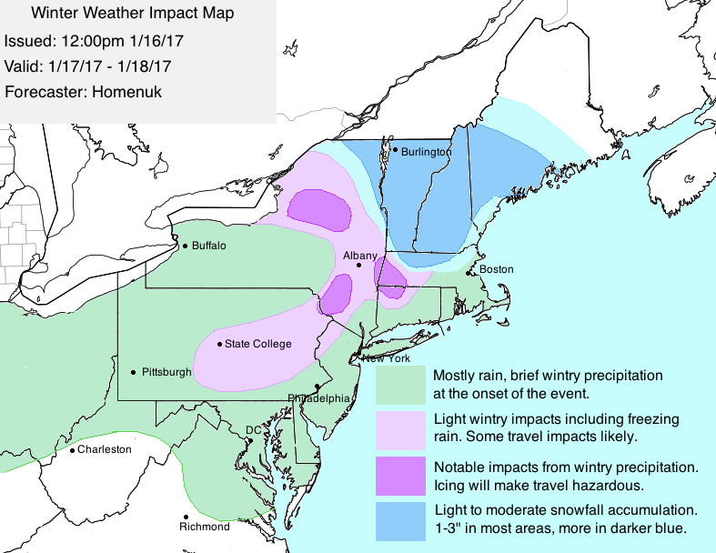 Our latest impact map takes all of these processes into account and attempts to lay out a general expected evolution throughout the entire region. Most of the I-95 cities are expected to experience rain, while in the interior, brief periods of icing are possible. The further north one goes, the more significant the event will become; and this will be especially true in New England where notable impacts are possible from mixed precipitation types in Northwest Connecticut and Western Massachusetts, with a light to moderate snowfall event in Northern Massachusetts, Vermont, New Hampshire, and Maine.