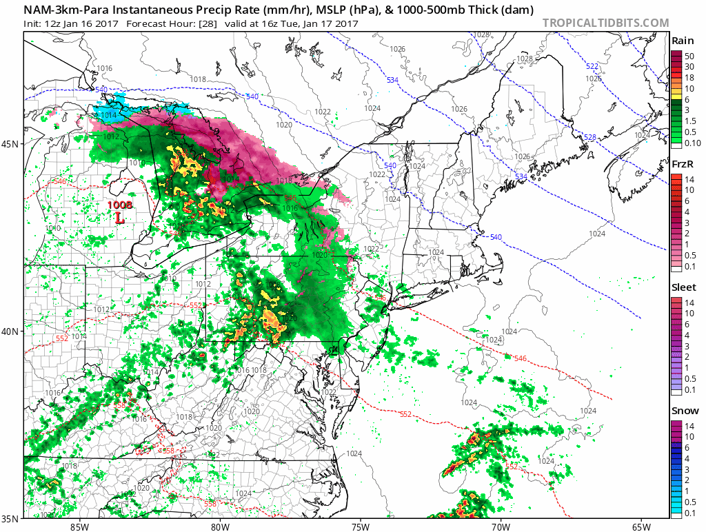Much of this precipitation will be driven by a process known as “Warm air advection” — in other words, the movement of warm air through multiple levels of the atmosphere. Lift for precipitation will move into the Northeast as the afternoon goes on, and the middle layers of the atmosphere will gradually warm from southwest to northeast. This will be suffice to change most areas over to rain in the Mid Atlantic States.