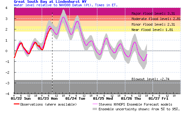 Flood guidance from Steven’s Institute around the Great South Bay at Lindenhurst, which is was near or slight above flood stage early this morning. Now forecast to reach at least moderate flooding leave during high tide late this afternoon and early this evening