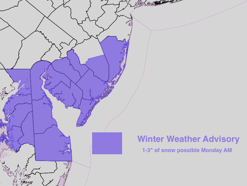As a result, the NWS has posted Winter Weather Advisories for the potential accumulation of 1 to 3 inches of snow. These advisories are relegated to South and Eastern portions of New Jersey.
