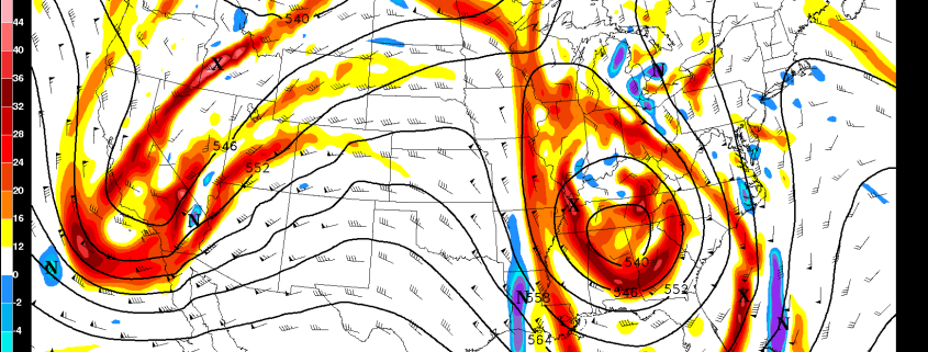 While most of the weather interest this time of year revolves around snowstorms, we are simply not in a pattern favorable for any in the next ten days or so. Instead, we have a very fast, active Pacific Jet with a plethora of disturbances running into the West Coast. Any one of these can theoretically bring rain to our area as they traverse the country, but that is largely dependent on the pattern downstream. As we head into this weekend, the pattern will become very “blocked up”, which means that any storm that moves east will be forced to slow down and amplify before it has any chance to move north and eastward towards our area. Essentially, the Pacific Jet serves as a highway, and the blocking pattern serves as a traffic jam that forces everything to slow down. When several shortwaves are forced to slow down, the traffic increases and backs up more with time, which forces the slowing down to move much further southwest with time. This means that several potent shortwaves are forced to interact with each other well to our southwest and turn into a monster storm system that has to slow down, and tap into plenty of Gulf of Mexico moisture.