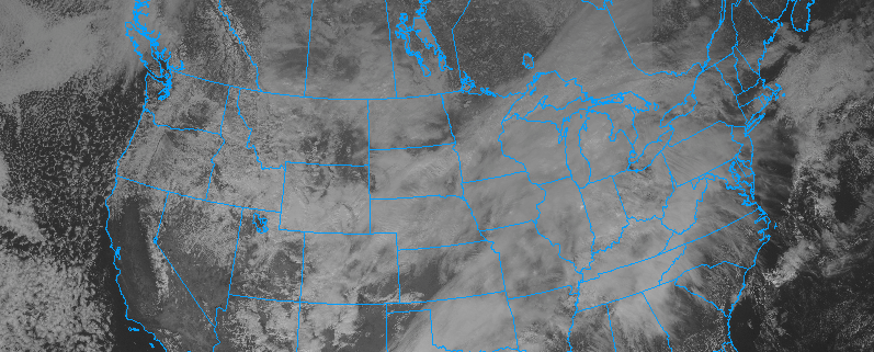 Current visible satellite and surface observations showing a rather thick cloud deck overspreading the Northeast (Simuawips.com)
