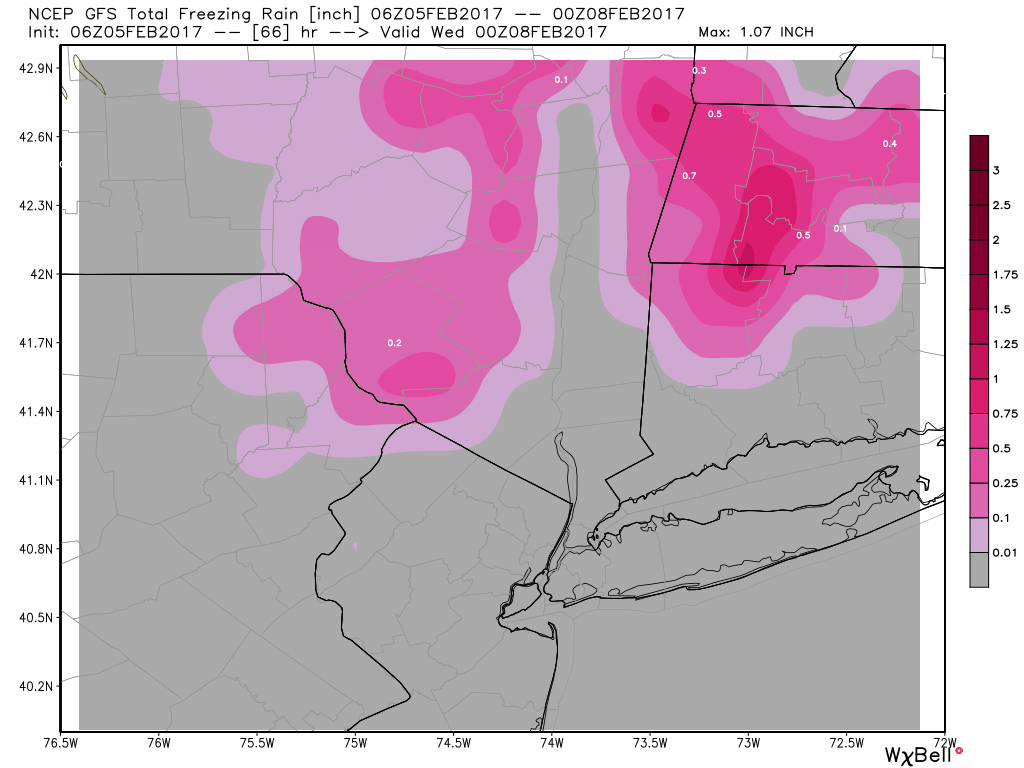 The GFS showing areas of freezing rain with ice accretion over some of the highest elevations over the region.