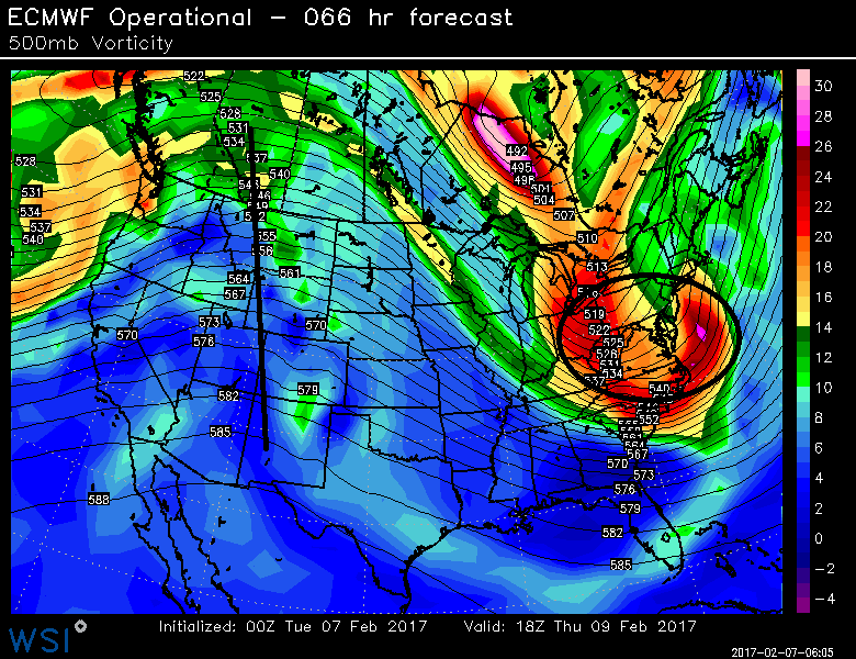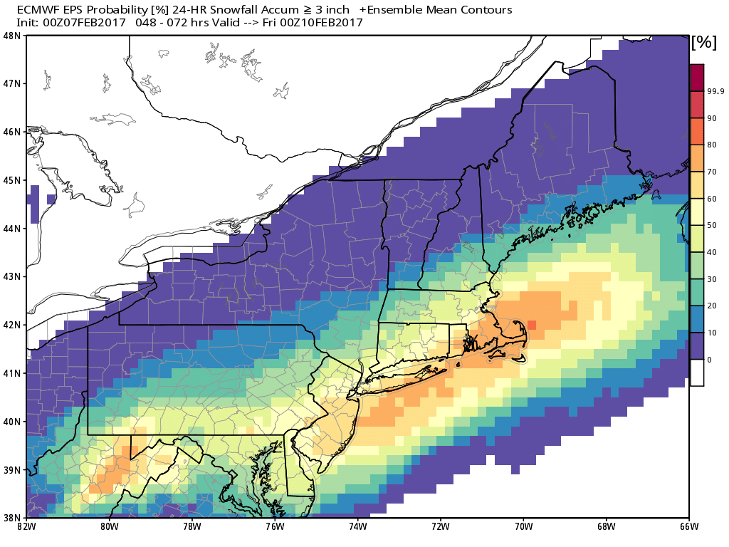 The general trend on much of the model and ensemble guidance over overnight and early Tuesday, is for a deeper trough with polar jet and pacific jet disturbances phasing, along the East Coast. This largely due a stronger ridge over the Western US. This will result in a wave of low pressure develop to the south, along cold front that will push through the region on Wednesday. Latest ECMWF and GFS models show a more intense low further north bringing a more significant snowfall to much of the region. Latest ECMWF ensemble guidance has 40%> probability for more than 3″ of snow near the I-95 corridor and areas south east