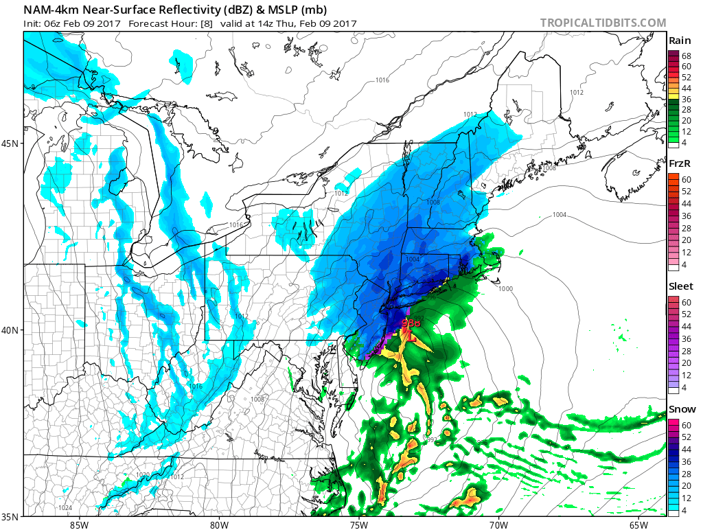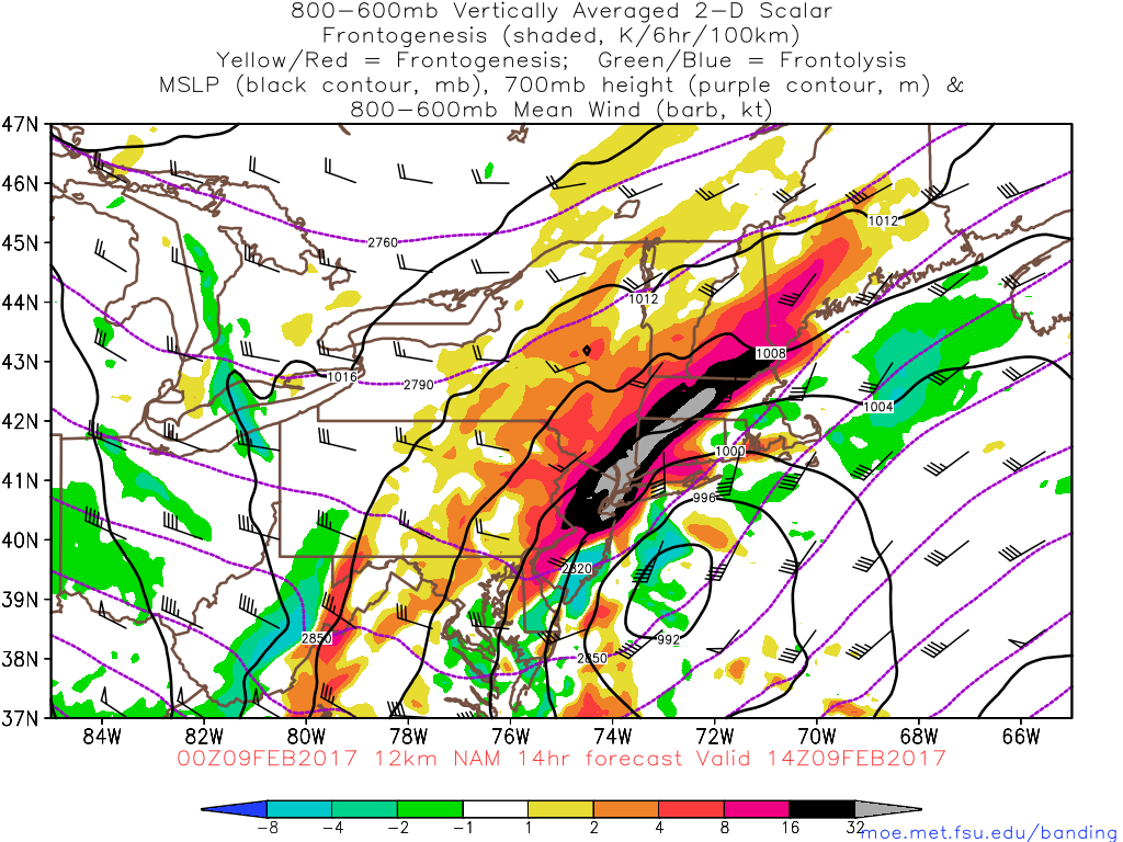NAM model showing intense frontogeneis moving through NYC metro region around 14z (9am) today.
