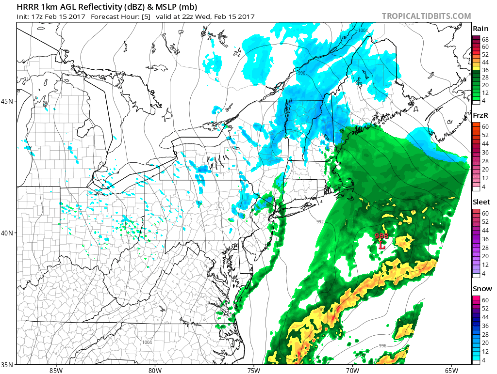 Most notably, perhaps, is the fact that this disturbance is missing a phase with a southern stream disturbance over the Mid Atlantic states, which would’ve forced the development of a much bigger and more powerful storm system. Nevertheless, its passage this afternoon and evening will lead to the the development of snow and rain showers.