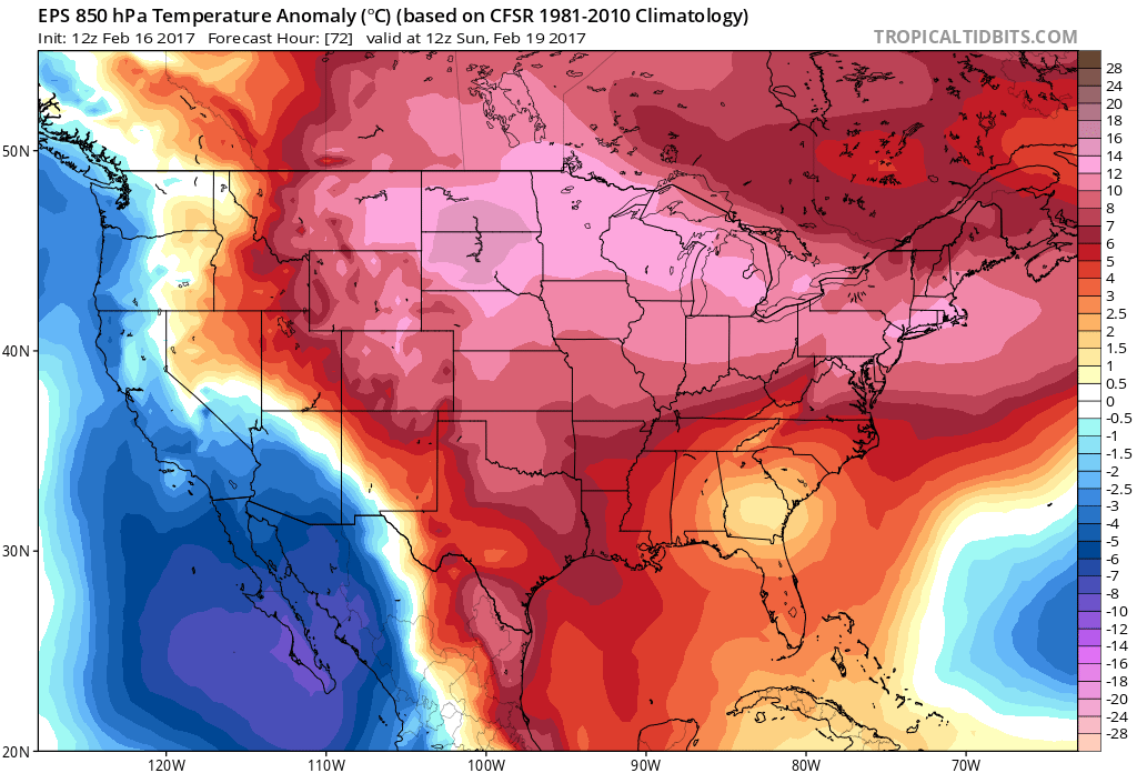 Ridges along the west coast that collapse eastwards into the Central and Eastern United States are notorious for allowing Pacific, maritime air to flow eastwards. Think of it this way: A large ridge on the West Coast, like a wave, holds Pacific air along its western fringes. When the jet stream collapses east, all of that air can flow eastwards as well, with no impetus to keep it away.