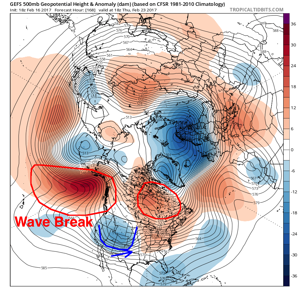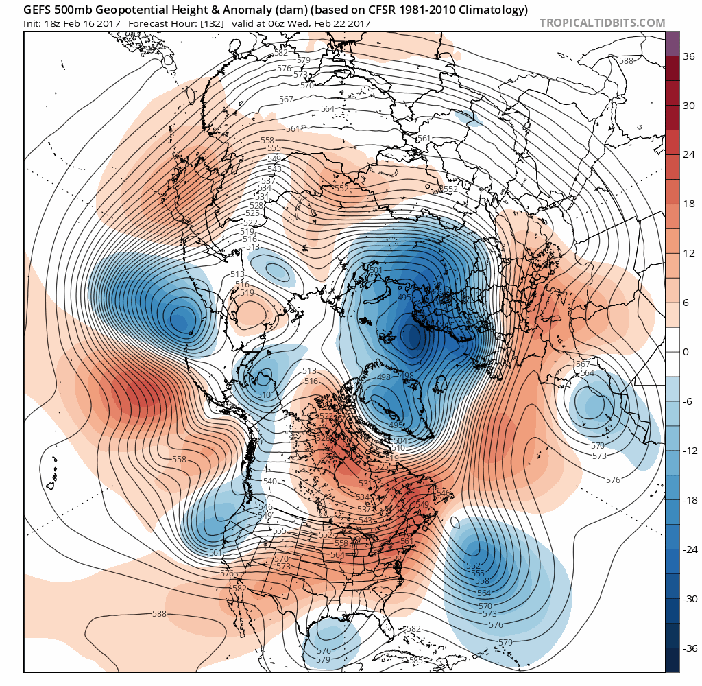 GFS Ensembles showing the evolution of the pattern. Pay attention to the ridging in the Eastern Pacific, and resulting lower heights in the Eastern US.