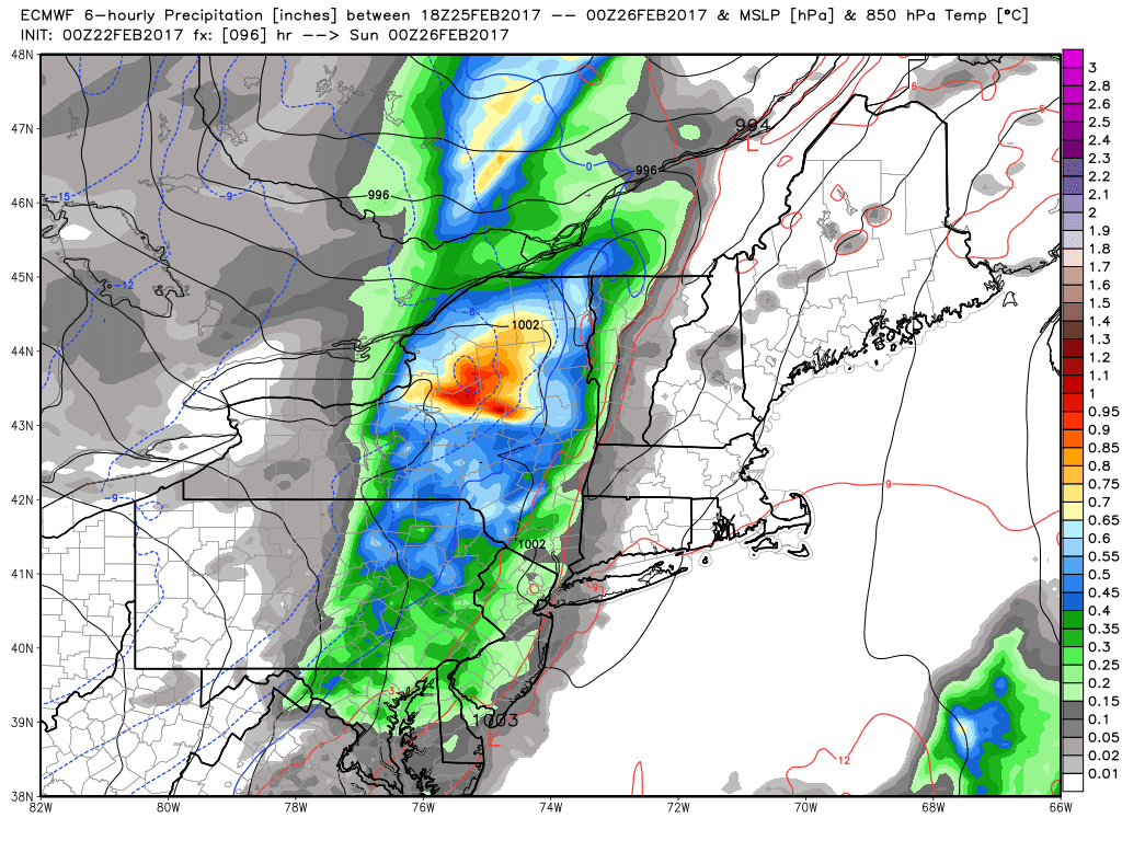 The ECMWF model showing heavy rainfall and possible t-storms moving into the region by Saturday evening