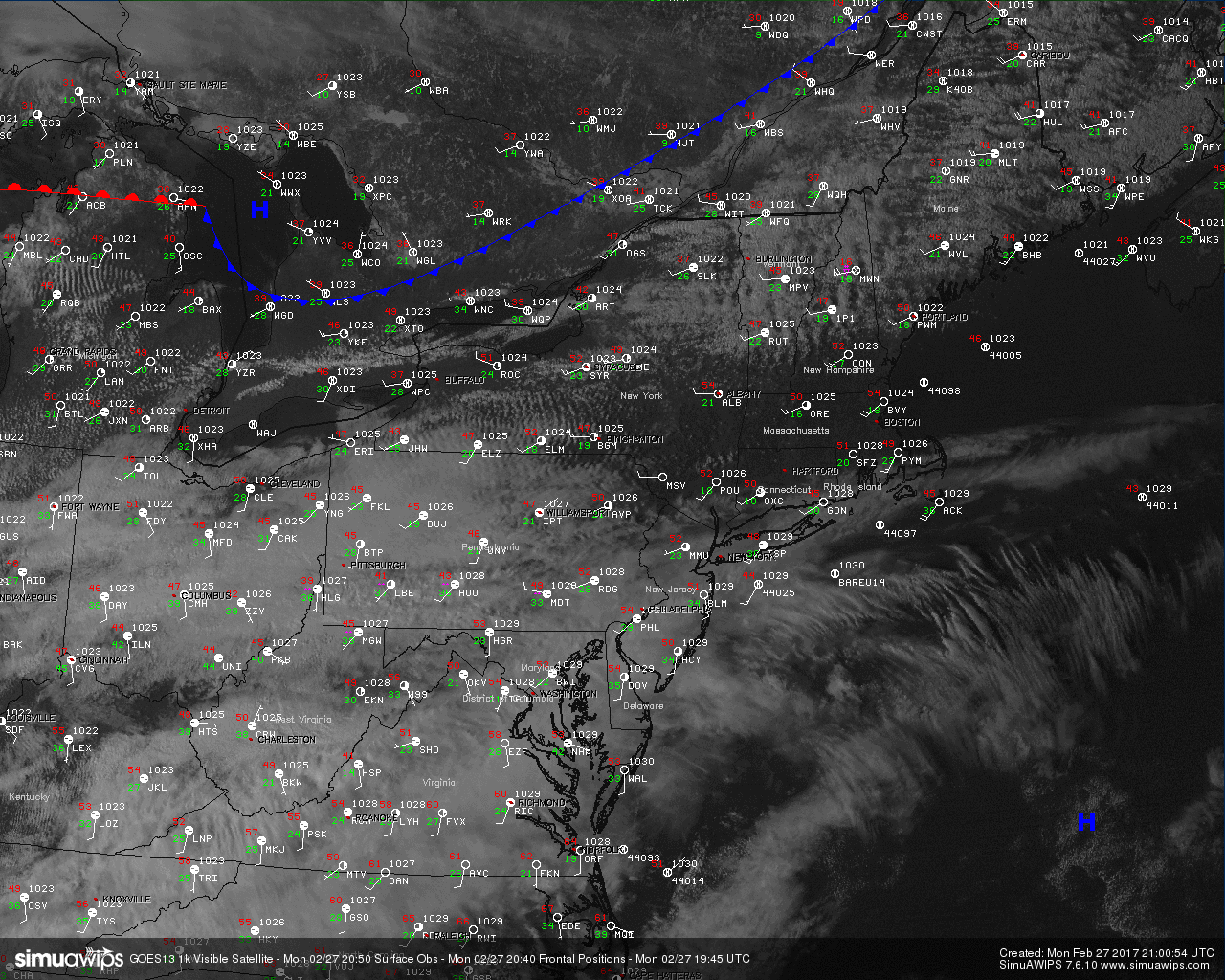 Current visible satellite and surface observations showing a rather thick cloud deck overspreading the Northeast (Simuawips.com)