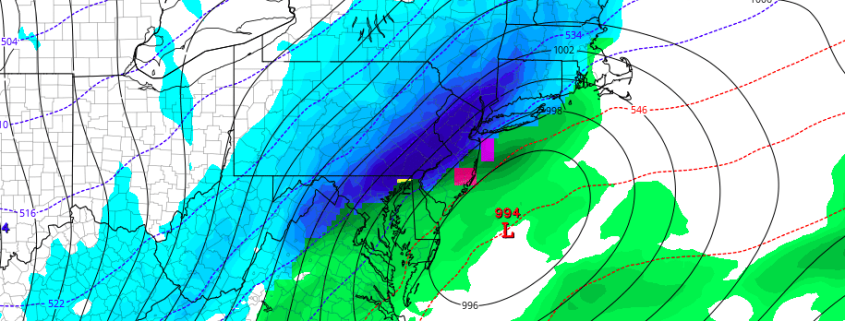 As was talked about on Monday, we have our two key pieces of energy that have to interact and come together this evening in order for our storm to take shape and really begin to intensify. If we look on the 500mb chart below, which is essentially what’s happening up in the atmosphere at roughly 18,000 feet, we can see our two distinct features highlighted in pink. Our first piece can be seen over Kansas City, Missouri this afternoon which has generated the beginnings of our storm over Arkansas and Tennessee with precipitation starting to break out all the way up into Illinois/Indiana/Ohio. As our second feature begins to dive south from its current position to the north of Bismark, North Dakota and interacts with the piece of energy in Missouri, the low pressure currently in the south will begin to speed up and track into northern Tennessee this evening. More precipitation will begin to blossom to the north of the low pressure area as time goes on. This low should steadily deepen as it tracks through Virginia by the early morning hours and bring the onset of the precipitation to the southern New Jersey by 2-3am. This area of snow and rain should gradually move up from southwest to northeast and since we have temperatures in the 50s-60s this afternoon, the initial precipitation may be in the form of a rain/snow mix due to residual warm air. As the precip starts to come down at a heavier rate, a switch to heavier snow/mix is likely for much of the area.