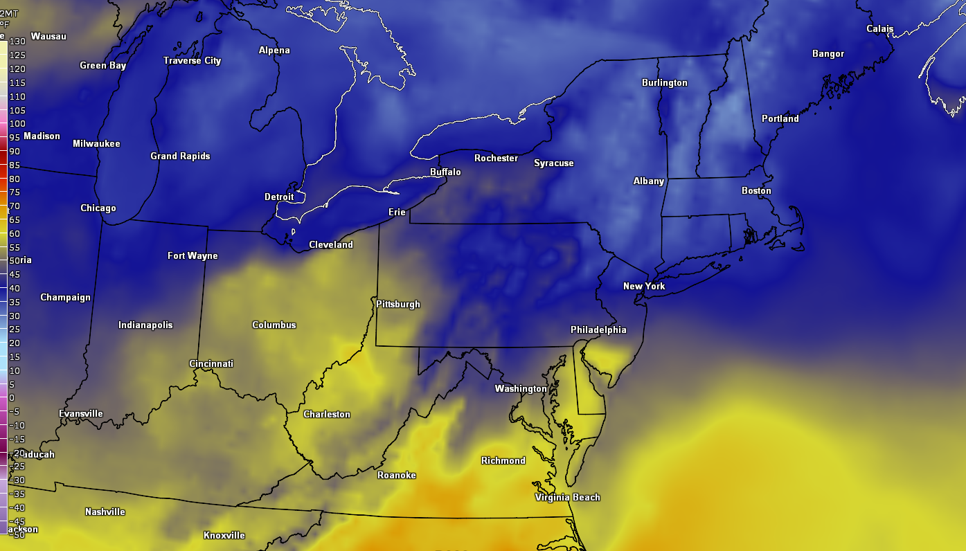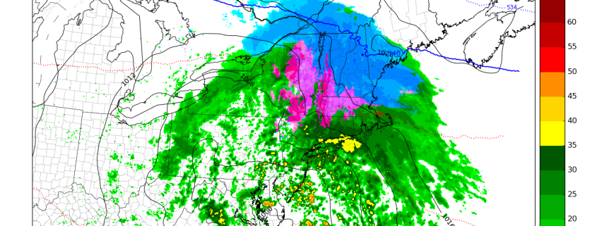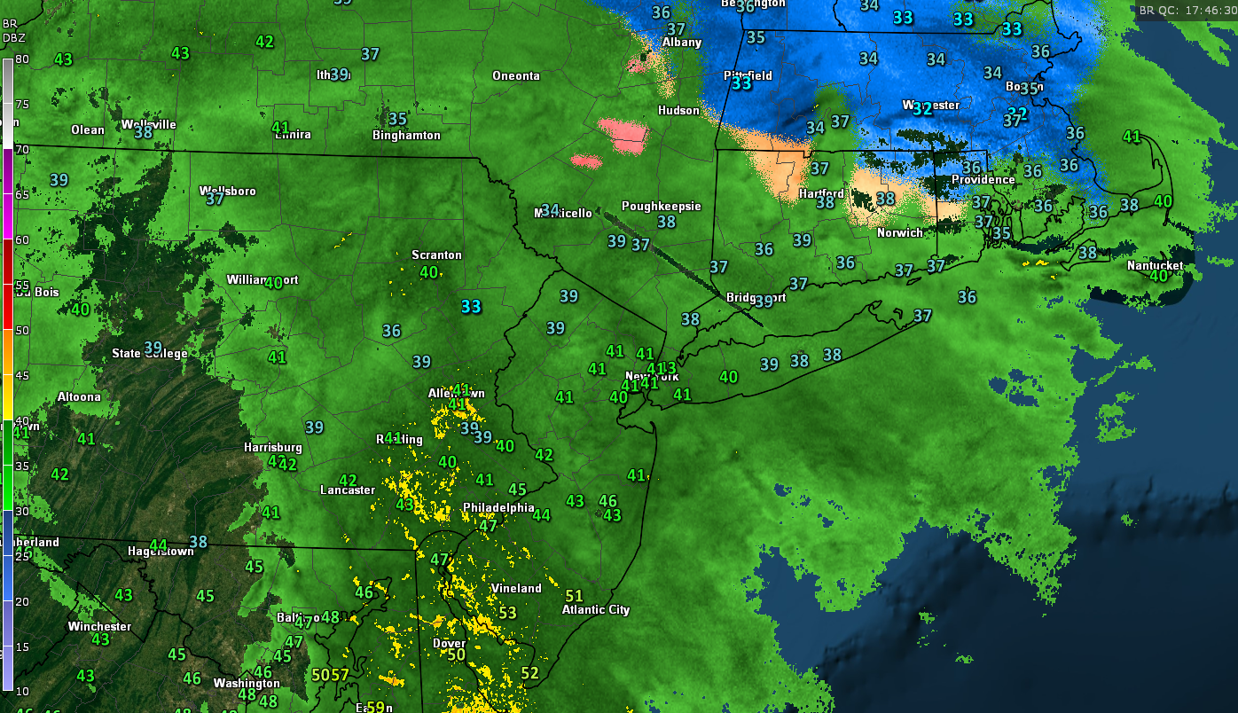 As of 2pm, the entire NYC metro area was experiencing moderate to heavy rainfall with the heaviest rains currently located over Southeast Pennsylvania. This rain is attributed to the low pressure system that traversed the central US over the past three or so days, dragging up very warm/moist air from the Gulf of Mexico in the process. Despite all of this warmer air being advected into the low pressure system, the high pressure to the north of us in Canada supplied the region with some very stubborn cold air yesterday that refuses to move much at all at the lower levels of the atmosphere.
